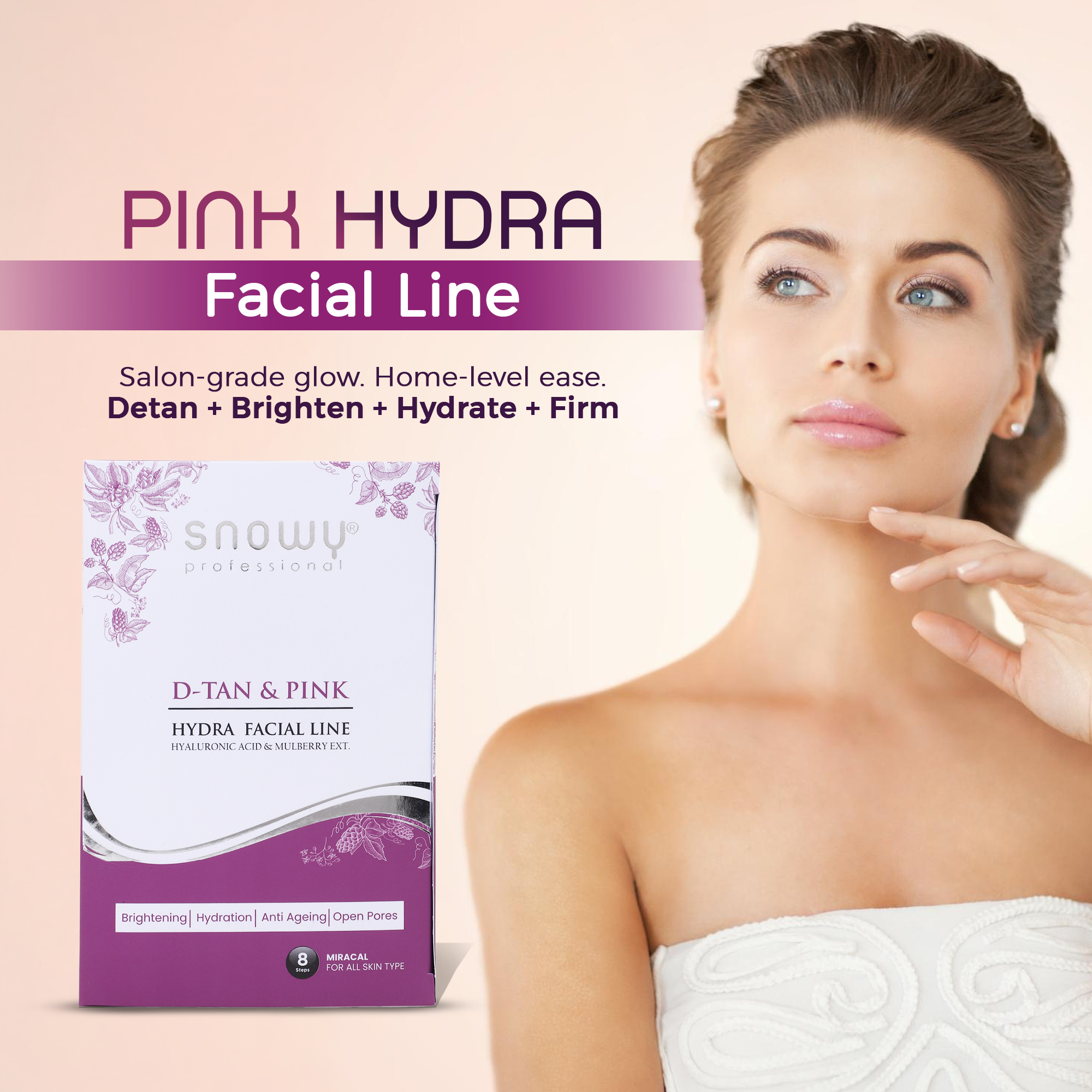 Discover the ultimate D-Tan & Pink Facial Line, an eight-step Snowy Detan Pink Facial system enriched with mulberry extract, hyaluronic acid, lactic acid and revitalizing algae extract. This dermatologist-inspired regimen erases tanning, brightens dark circles and smoothes fine lines while minimizing pores for a luminous, even complexion. Ask your beauty expert at your favorite salon for a premium experience that transforms your skin’s texture and reveals radiance. Try it today.