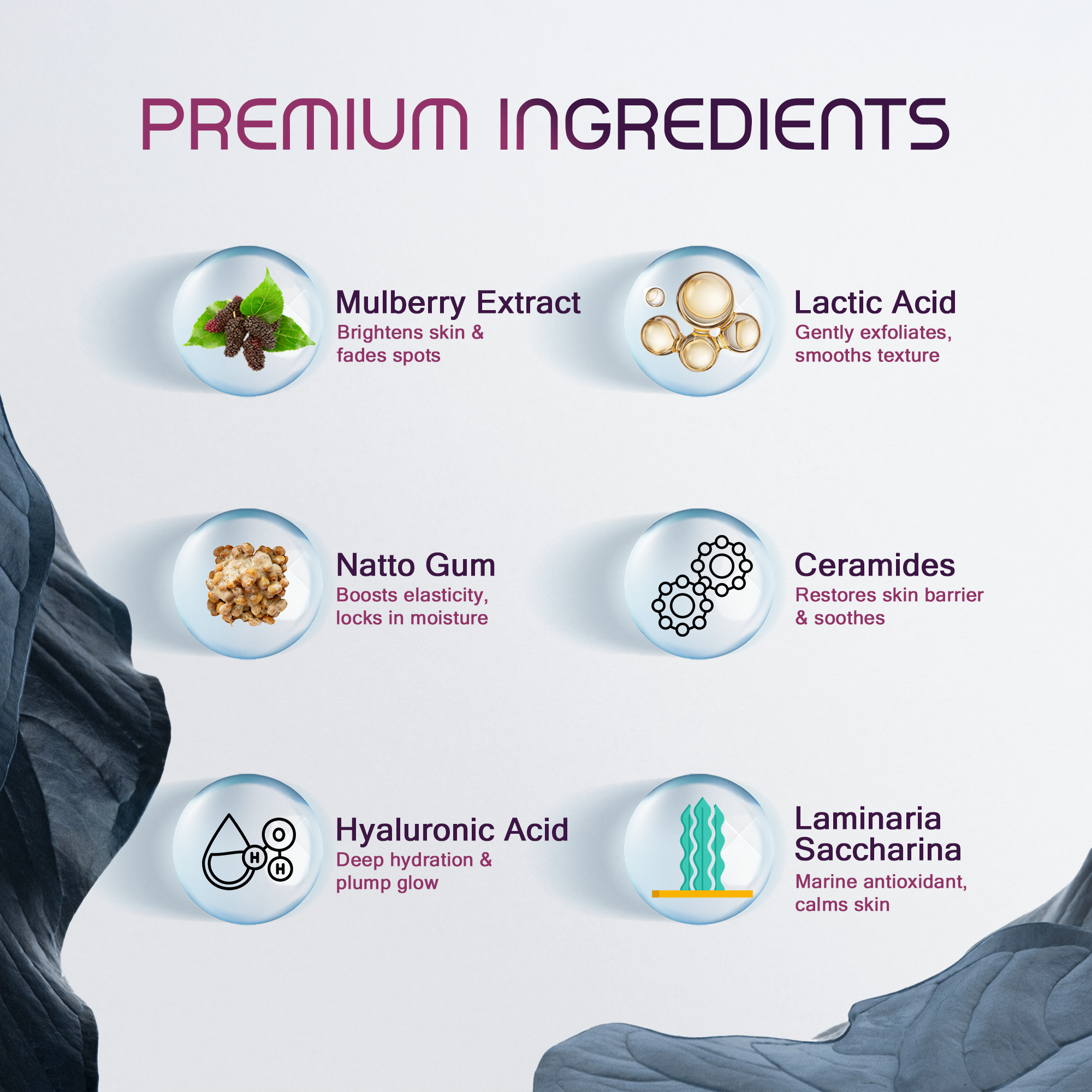 Natto Gum: Fermented soybean biopolymer rich in poly-γ-glutamic acid, forms a breathable moisture-locking film, enhances skin elasticity and firmness, smooths fine lines, reduces trans epidermal water loss, reinforces barrier function, and boosts delivery of other actives.