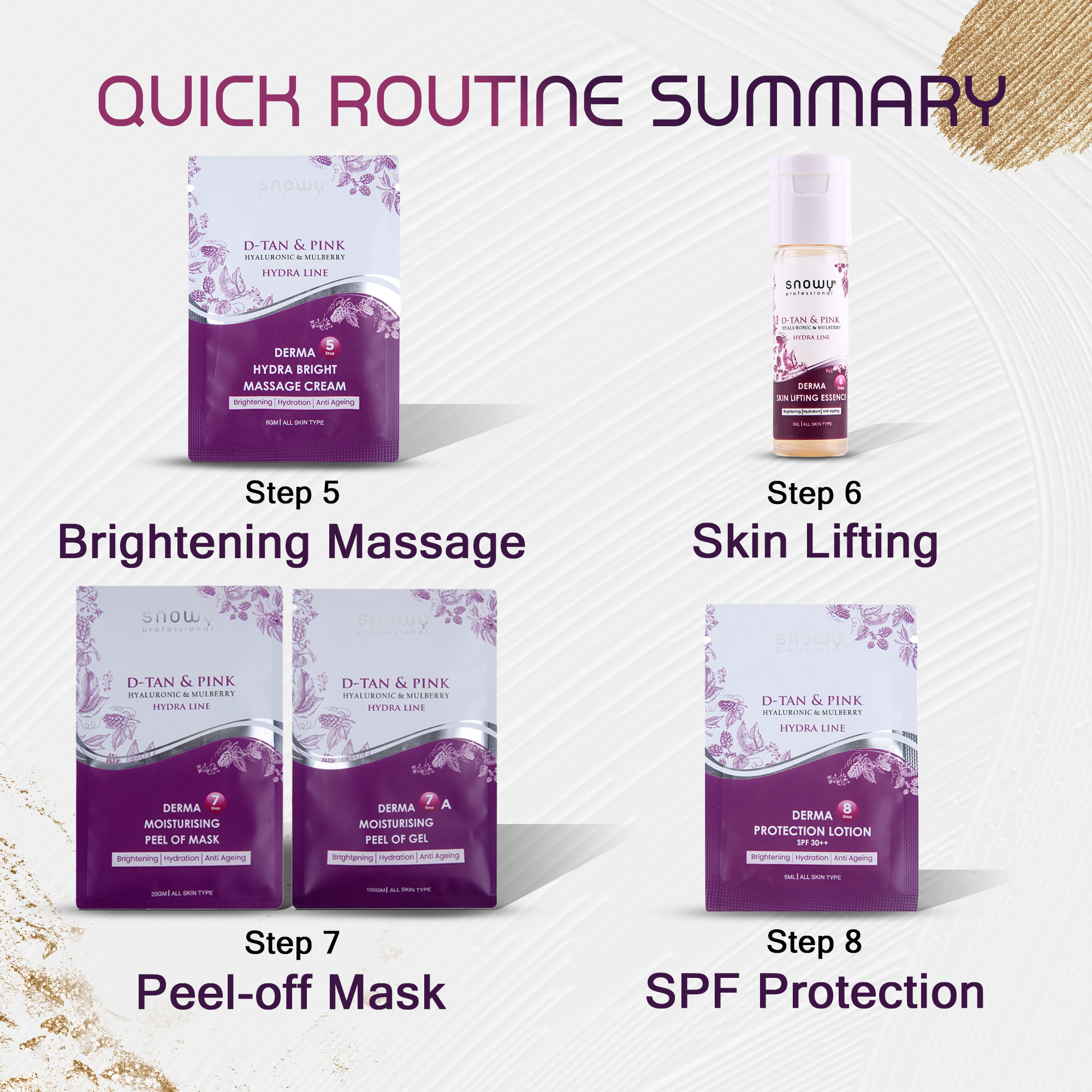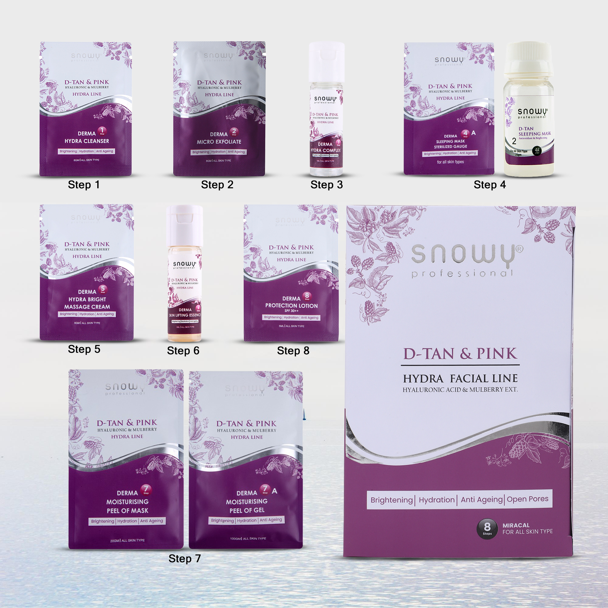 Embark on a transformative eight-step journey to luminous skin with the D-Tan & Pink Facial Line by Snowy Detan. Harnessing nature and science, each application blends potent mulberry extract, hyaluronic acid, lactic acid, and nutrient-rich algae to gently lift tan, fade dark circles, and refine texture. Dermatologist-inspired actives work synergistically to reveal clarity and radiance.