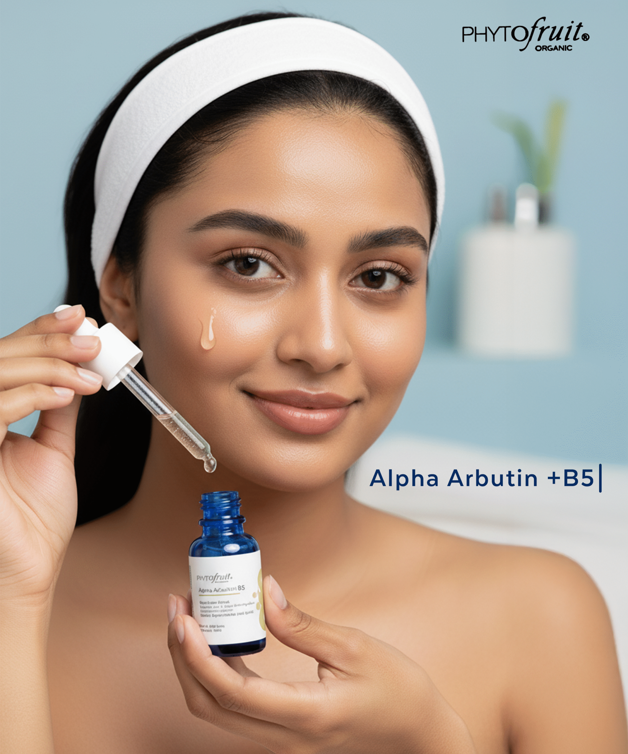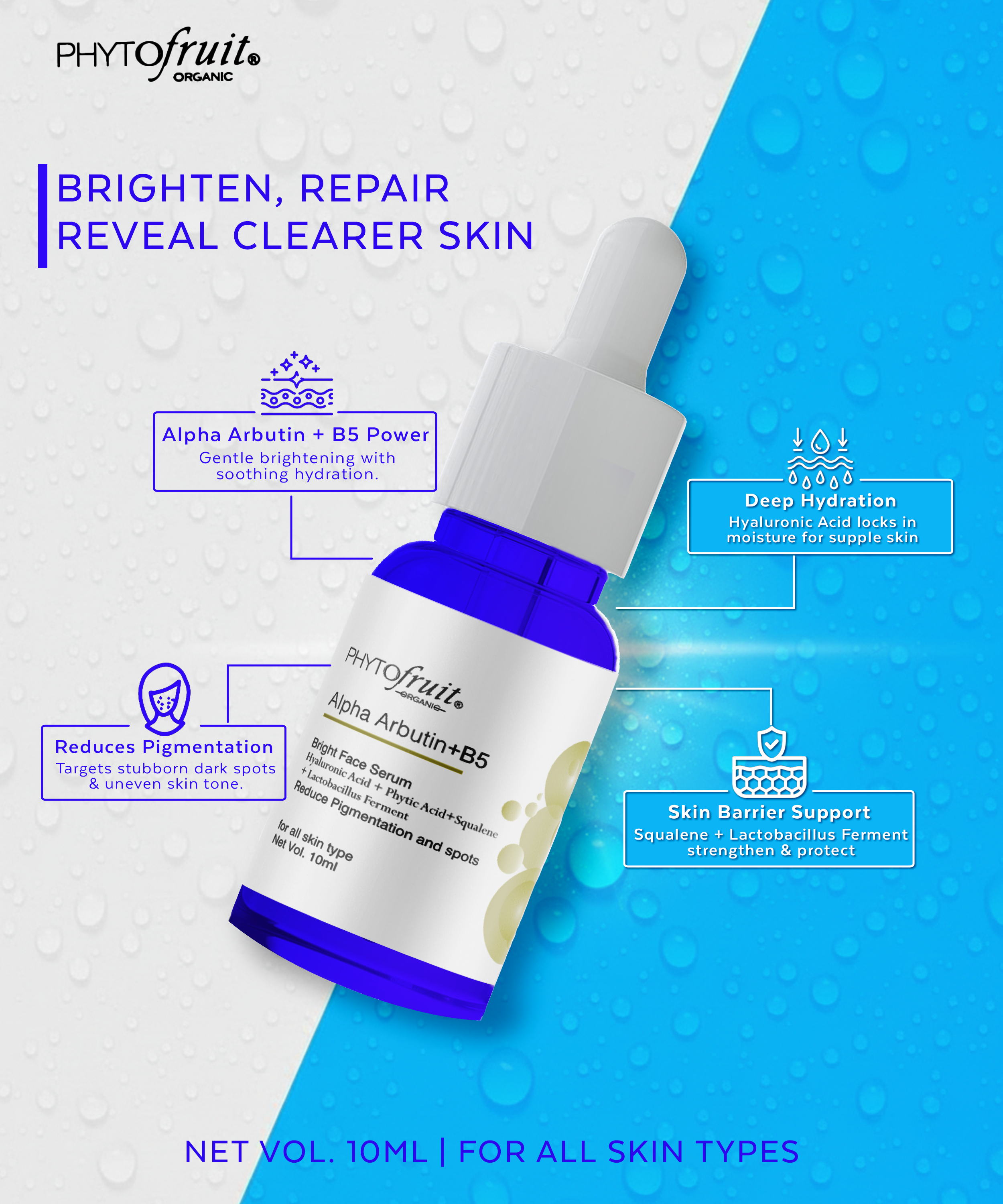 Phytofruit Alpha Arbutin + B5 Bright Face Serum is a scientifically crafted formula designed to target dullness, uneven tone, and dehydration. Powered by Alpha Arbutin, it helps reduce hyperpigmentation and dark spots by regulating melanin activity, revealing a brighter, more even complexion. Niacinamide strengthens the skin barrier, minimizes pores, and refines texture, while Vitamin B5 (Panthenol) soothes, repairs, and enhances skin resilience. Phytic Acid, a gentle antioxidant and exfoliant, supports cellular renewal and protects against environmental stressors. To lock in hydration, Hyaluronic Acid delivers deep moisture, plumping the skin and improving elasticity. Lightweight, fast-absorbing, and free from harsh chemicals, this serum is suitable for all skin types, leaving skin radiant, youthful, and revitalized with consistent use.